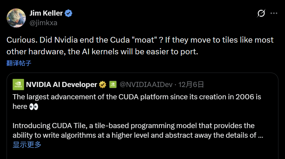 “英伟达是不是打破了CUDA的‘护城河’?如果他们像大多数其他硬件一样转向分块式架构,AI内核的移植就会更容易。”Jim Keller在“X”平台上写到。