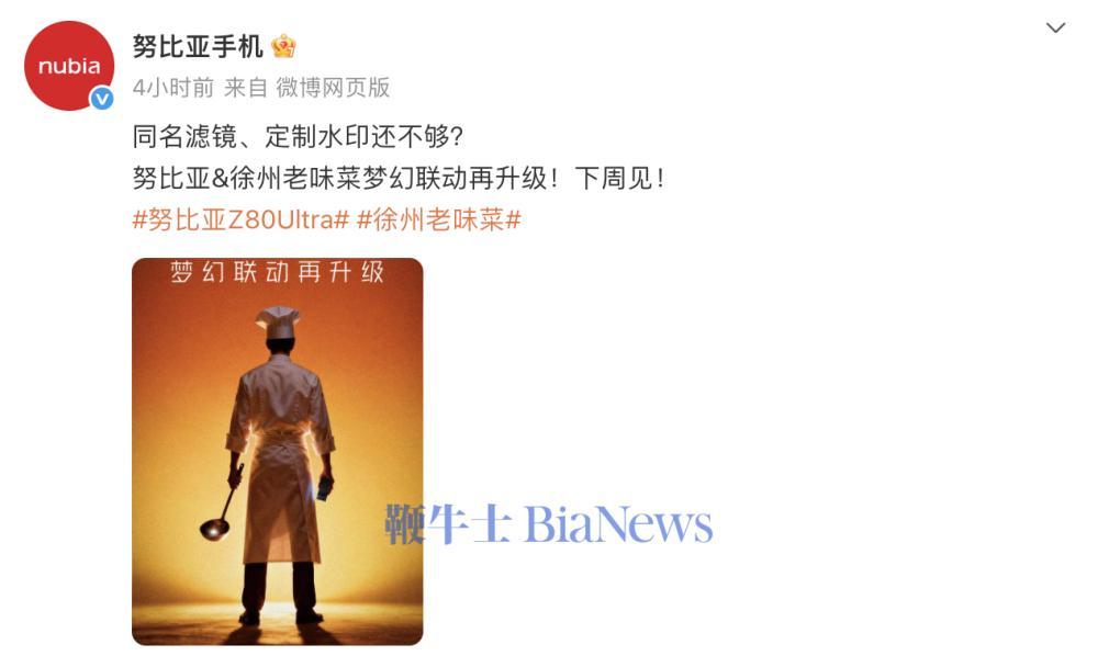 12月10日,努比亚手机官方宣布,与“徐州老味菜”的梦幻联动再度升级,具体合作细节将于下周正式揭晓。