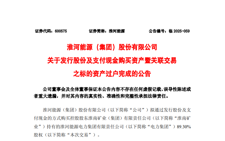 12月10日,淮河能源发布公告称,其通过发行股份及支付现金方式购买控股股东淮南矿业(集团)有限责任公司(以下简称“淮南矿业”)持有的淮河能源电力集团有限责任公司(以下简称“电力集团”)89.30%股权的重大资产重组事项,已完成标的资产过户手续,相关工商变更登记已办理完毕。