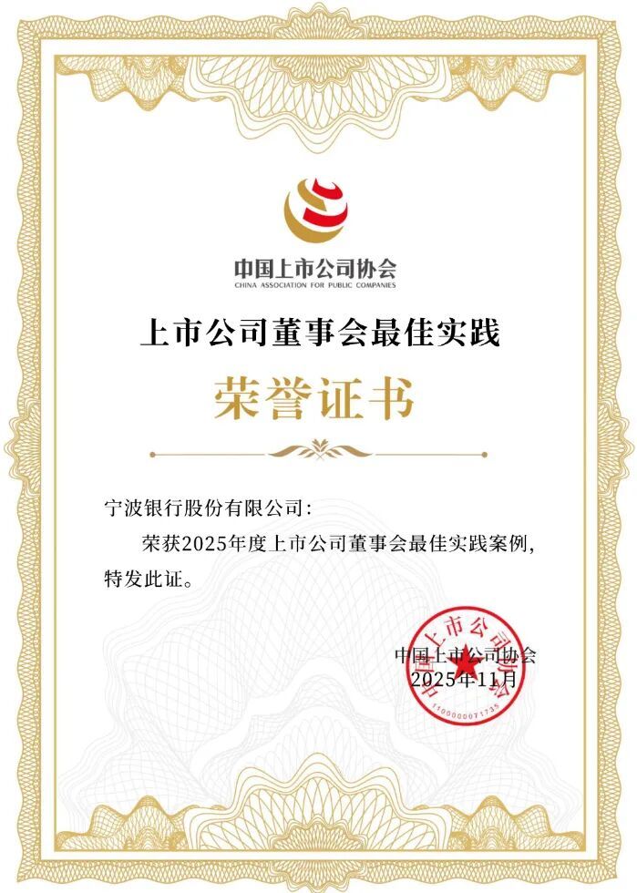 近日,中国上市公司协会三项重磅年度大奖评选结果出炉,宁波银行凭借在公司治理与证券事务工作中的卓越表现,喜获2025年“上市公司董事会最佳实践”和“上市公司董办最佳实践”及“上市公司董事会秘书履职5A评价”三大殊荣。