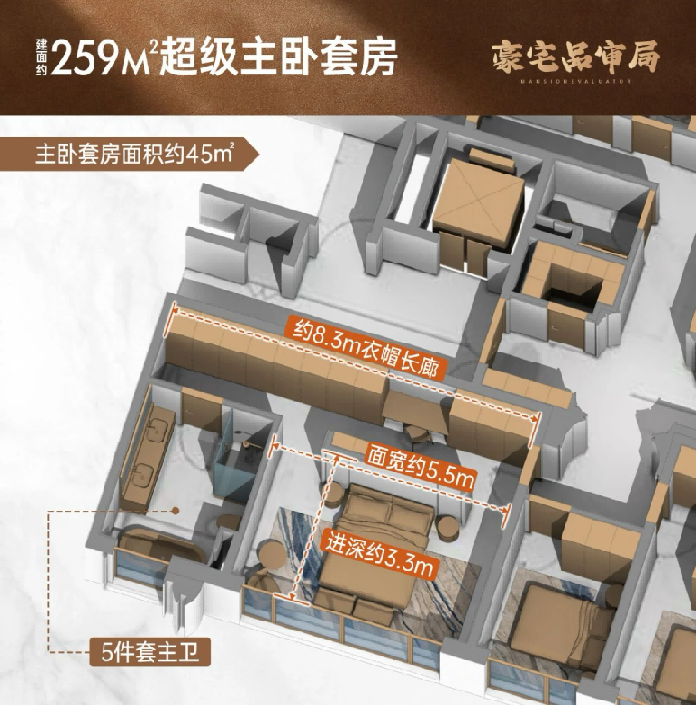 这不是卧室,而是以全球五星级酒店总统套房为蓝本,打造专属主人的奢享天地:双台盆卫浴区,早上两人同步洗漱,不用排队等位置;靠窗的浴缸,泡澡时能望到园林的绿意;步入式衣帽间,能放下四季高定,连配饰都有专属收纳格;
