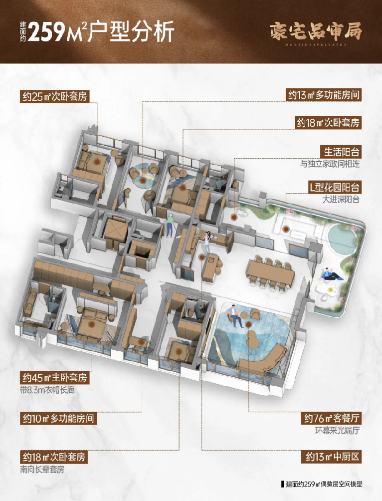 在峯萃的产品逻辑里,鼎豪259㎡产品可谓是独树一帜,打破平层的局限,把别墅的自然奢享、私域感,搬到云端,每一寸空间都为顶流圈层的社交与私享量身定制,都是空中“墅级生活”的精准落地: