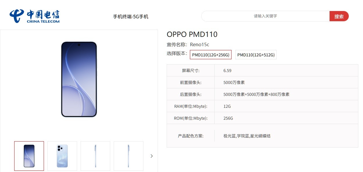 12月10日消息,OPPO Reno15系列已于11月17日正式推出标准版与Pro机型,搭载天玑8450处理器,起售价2999元。发布会现场同步官宣,定位“入门之选”的OPPO Reno15c将于12月下旬发布,目前该机已现身中国电信终端产品库,核心配置与外观细节正式曝光。