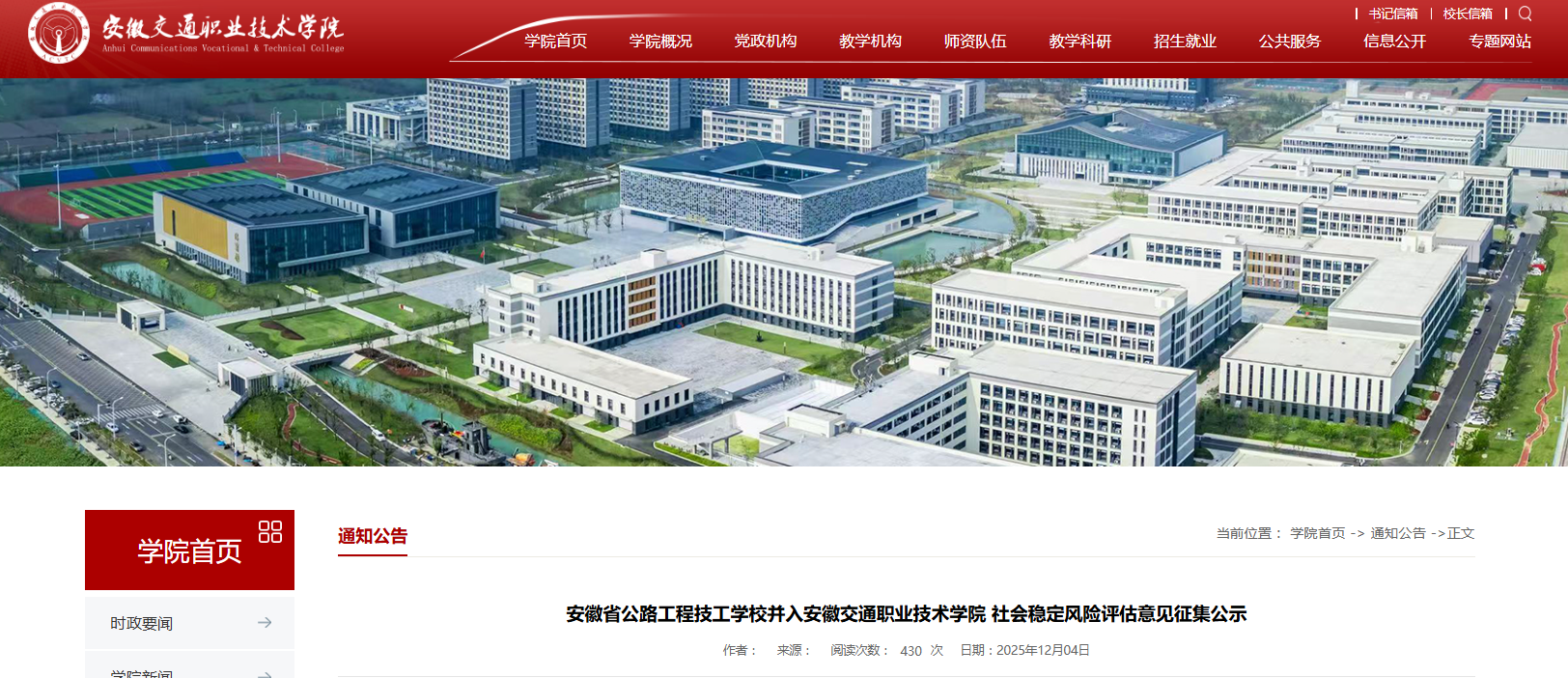 根据中共中央办公厅、国务院办公厅关于重大决策社会稳定风险评估工作要求及《安徽省重大行政决策程序规定》,现开展安徽省公路工程技工学校并入安徽交通职业技术学院决策事项社会稳定风险评估工作,向公众公开征集对该项决策的意见和建议。