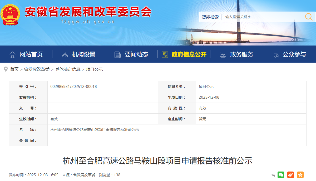 现将杭州至合肥高速公路马鞍山段项目申请报告核准内容予以公示。公示时间自公示之日起5个工作日(12月8日—12月12日),如有意见和建议,请向省发展改革委基础设施发展处反映。反映以来人或署名来信(包括电子信函)方式,并提供姓名及联系电话,对匿名方式提出异议的不予受理。