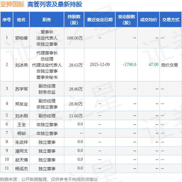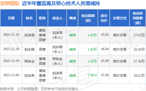 亚钾国际近半年内的董监高及核心技术人员增减持详情如下:
