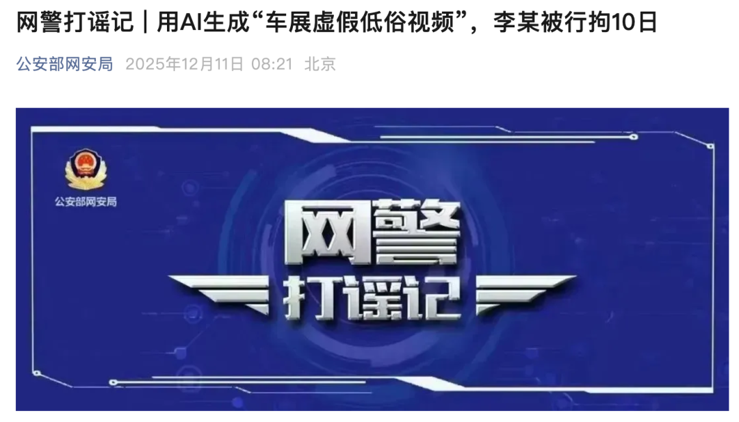 12月10日,广州天河公安发布警情通报:近日,广州天河警方接报警称,互联网传播一条以某汽车品牌展台为背景的虚假低俗视频,公安机关迅速开展调查。经查,李某(男,36岁)为炫耀个人技术,利用AI技术生成虚假视频,并在社交平台发布,造成不良社会影响。目前,警方已依法对李某作出行政拘留10日的处罚。警方提示:网络非法外之地,公安机关将严查严惩故意编造、传播网络谣言等违法犯罪行为,请广大网友不信谣不传谣,共同维护网络清朗空间。