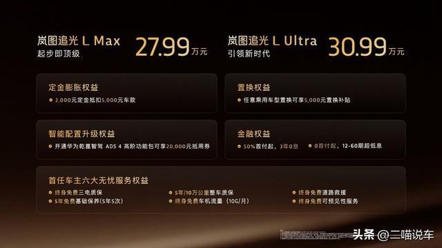 12月10日,北京,岚图追光L在“破晓”发布会上宣布正式上市。此次新车推出2款配置版型,官方指导价:Max版27.99万元、Ultra版30.99万元,同时公布了总价值5.2万元的终身免费三电质保、五年免费基础保养等首任车主六大无忧服务权益,以及超高价值的3年0息金融权益。其身上汇聚的多项行业第一配置,使其有实力成为中国高端轿车市场一款划时代的“破晓”之作。