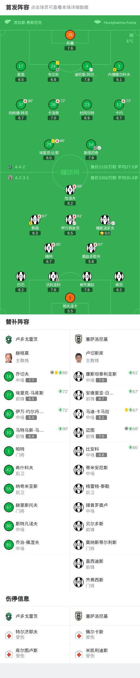 北京时间12月12日,欧足联欧洲联赛联赛阶段第6轮展开较量,卢多戈雷茨迎战塞萨洛尼基。比赛中,斯塔尼奇率先为卢多戈雷茨取得进球。随后,德斯波多夫接伊万努舍茨助攻将比分扳平。下半场开始不久,德斯波多夫送出助攻,沃利亚科破门帮助塞萨洛尼基反超比分。卢多戈雷茨由迪尼斯-阿尔梅达助攻韦尔东迅速回应,将比分再度拉近。斯塔尼奇随后贡献一次关键助攻,乔切夫得球后破门助球队追平。临近比赛结束,迈图为塞萨洛尼基打入一球,再度改变场上局势。最终双方3比3握手言和。