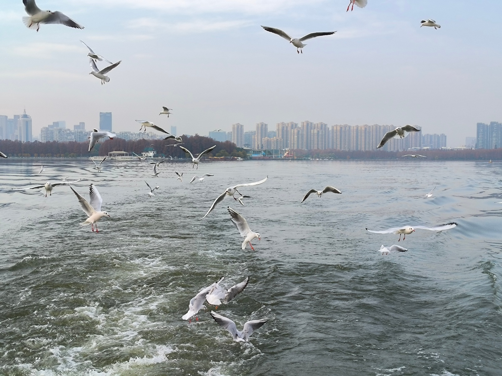 尽管红嘴鸥因胆大活泼而闻名,但目前东湖的种群仍保持着对人类的天然警惕。记者乘船观察发现,这些“白色精灵”虽会密集环绕游船飞行,却极少降落到甲板上,更不会从游客手中直接取食。