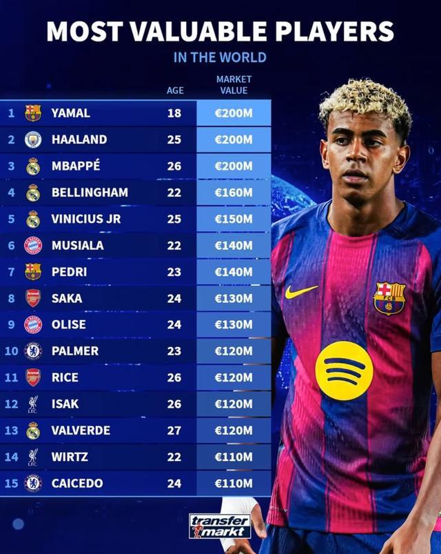 1. 亚马尔(亚马尔) 18岁 2亿欧元