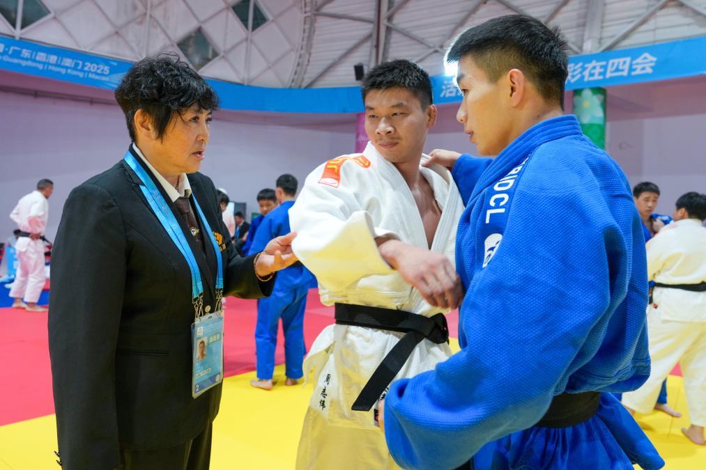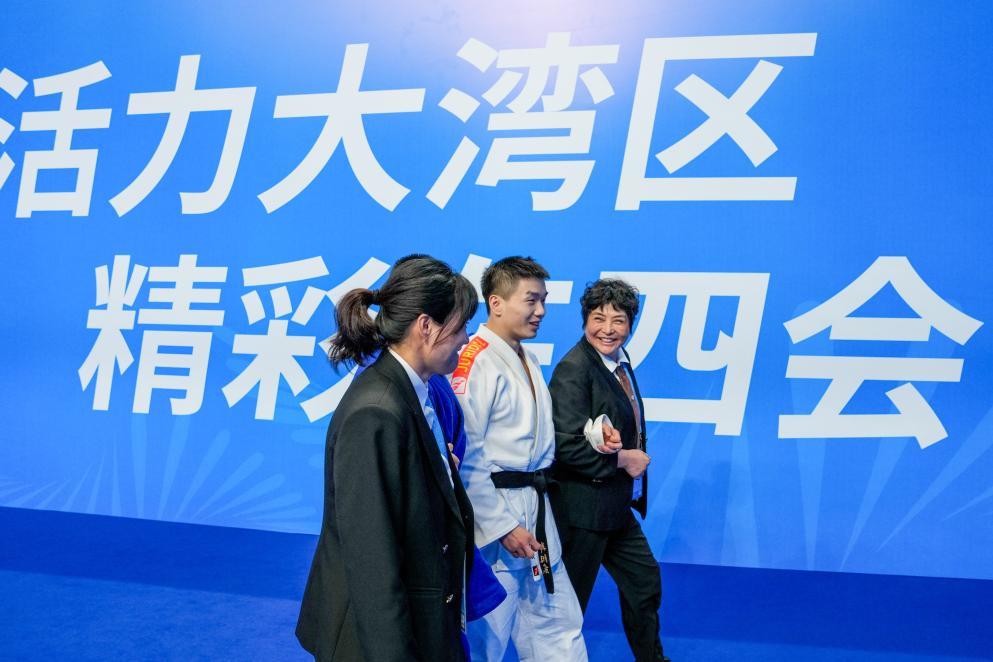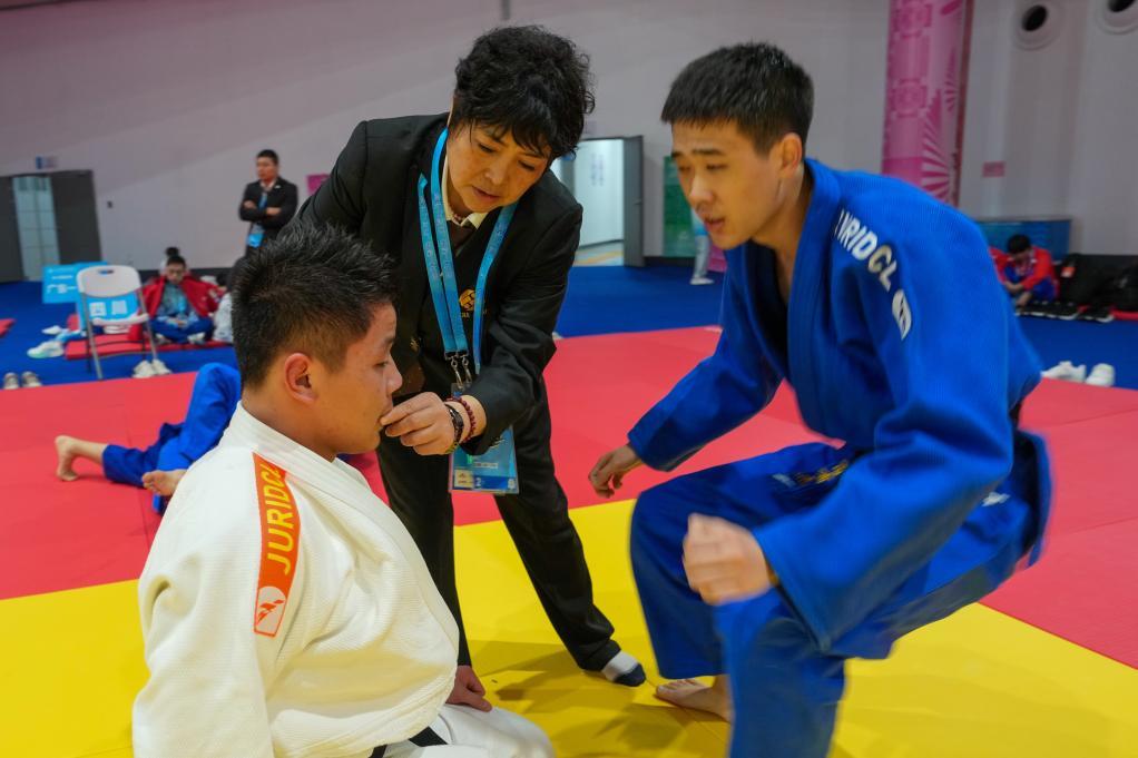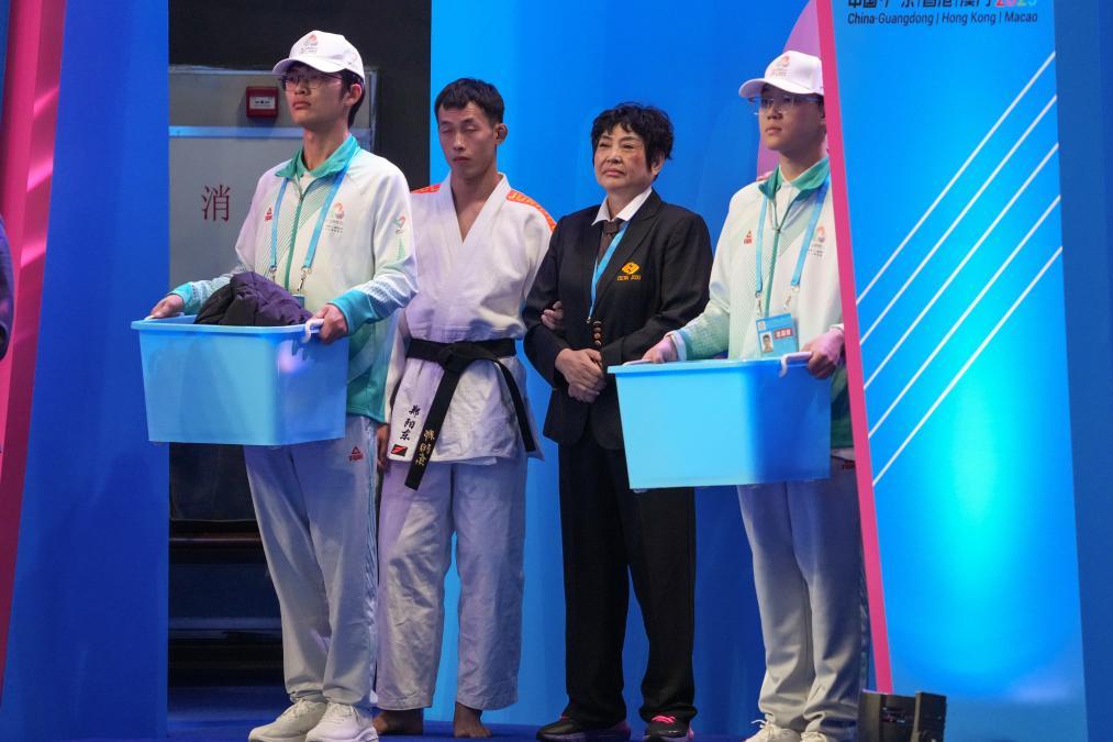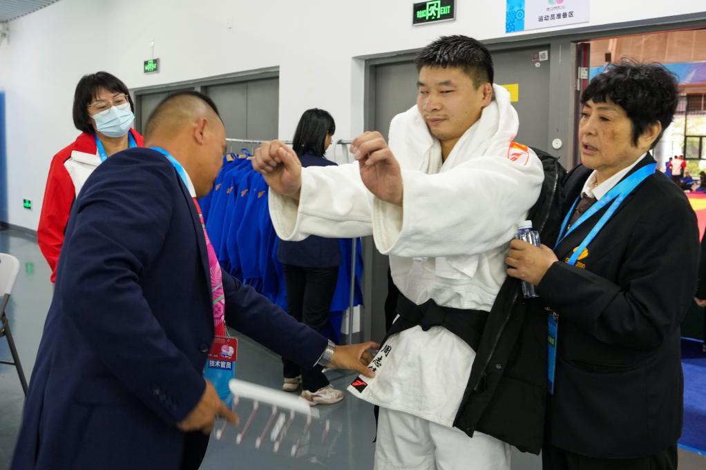12月10日,李跃华(右一)带领队员周志伟(右二)进行赛前检查。周志伟获得全国残特奥会盲人柔道男子J1-81公斤级比赛金牌。