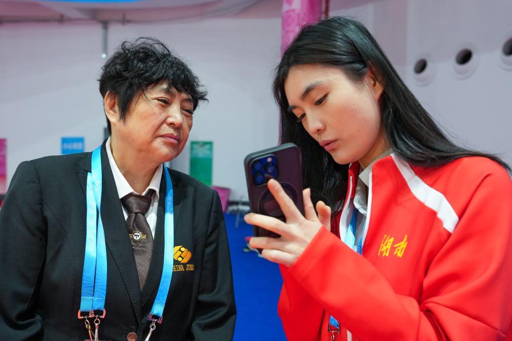 12月10日,李跃华(右)在赛后引导队员史怡婕退场。史怡婕获得全国残特奥会盲人柔道女子J1-60公斤级比赛金牌。