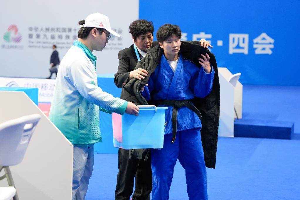 12月11日,李跃华(中)在赛后为队员刘立披上外衣。刘立获得全国残特奥会盲人柔道女子J1-70公斤级比赛金牌。