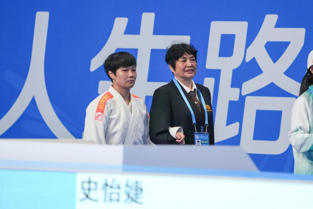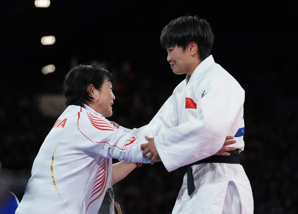 2024年9月5日,在巴黎残奥会盲人柔道女子57公斤J1级决赛中,史怡婕11比0战胜美国选手穆提娅,获得金牌。史怡婕(右)在比赛后和教练李跃华庆祝胜利。