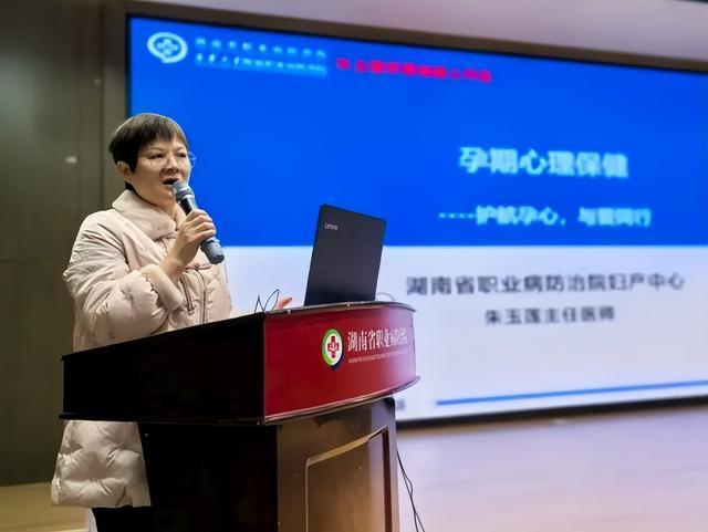 在主题讲座环节,湖南省职业病防治院(南华大学附属职业病防治院)妇产中心主任朱玉莲围绕孕产期不同阶段的心理特点,系统讲解了情绪波动调节、压力释放、产后心理调适等知识,并结合实例,介绍了常见心理问题的识别方法与应对技巧。