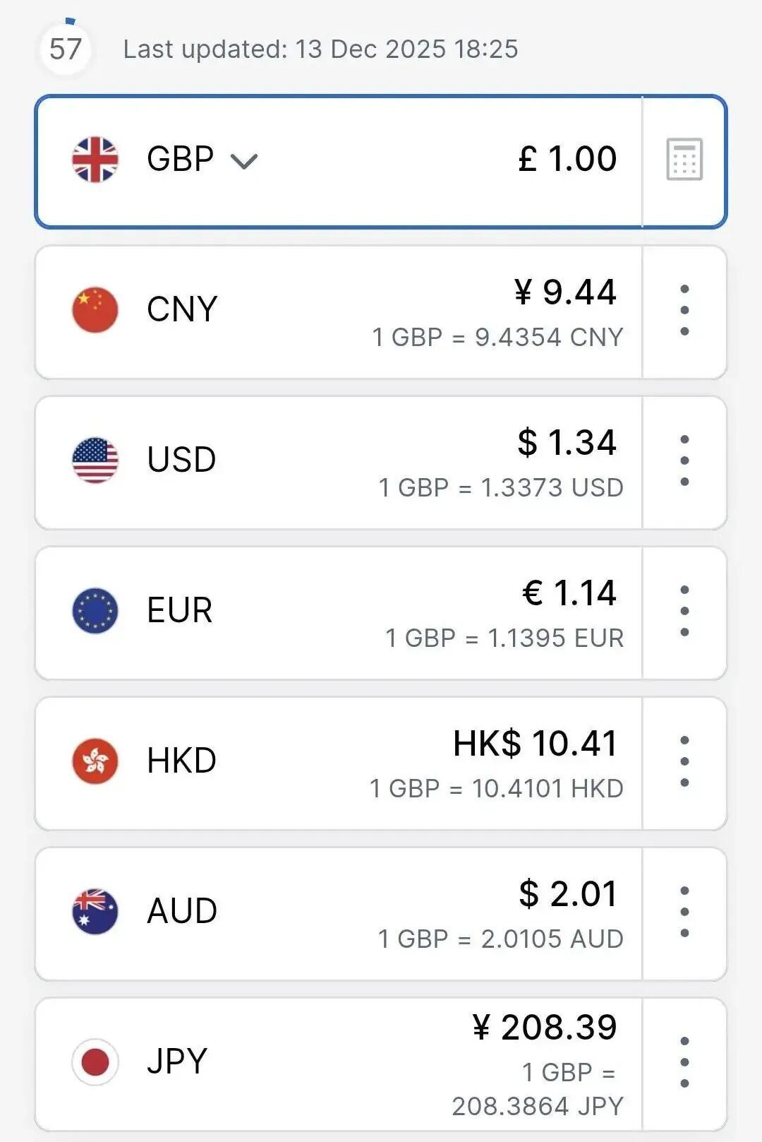 截至发文时(2025年12月13日),英镑最新汇率情况如下:
