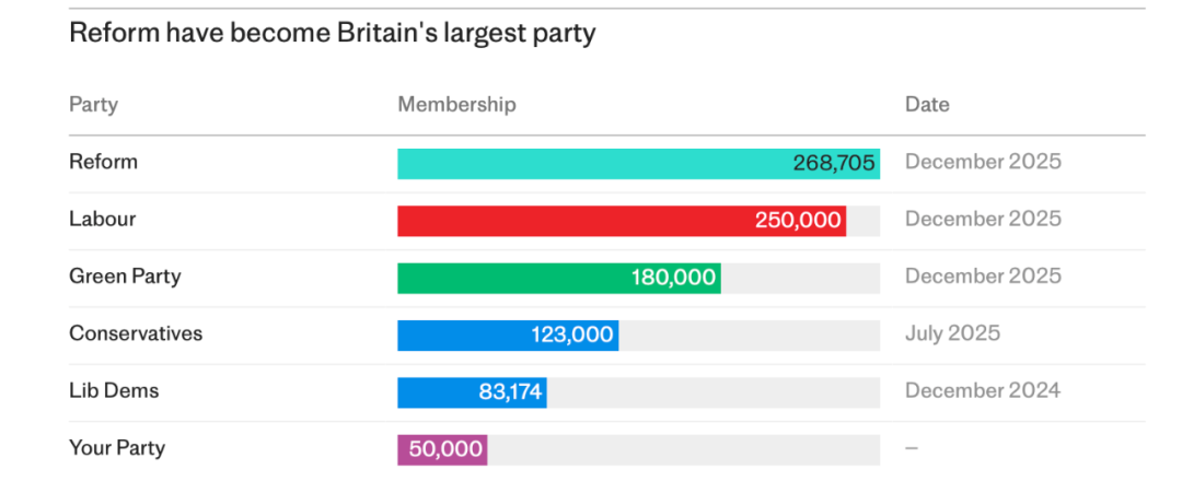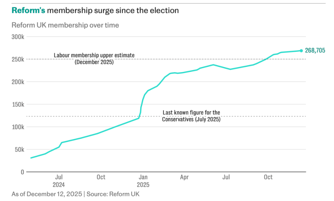 而自2024年7月英国大选以来,右翼改革党的成员人数激增。到了去年的节礼日(Boxing Day),改革党的成员数量就超过了保守党。