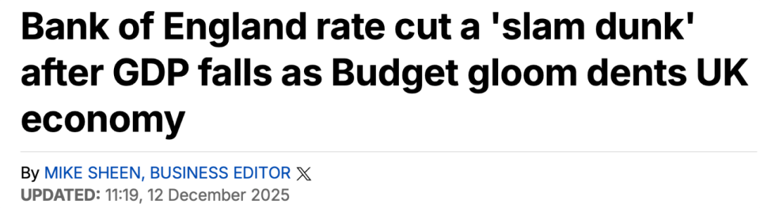 十月份经济萎缩的消息让金融市场进一步认为,英国央行在下周四(12月18日)的会议上宣布降息25个百分点至3.75%的可能性高达90%。