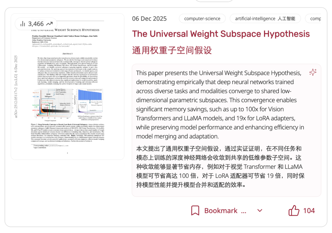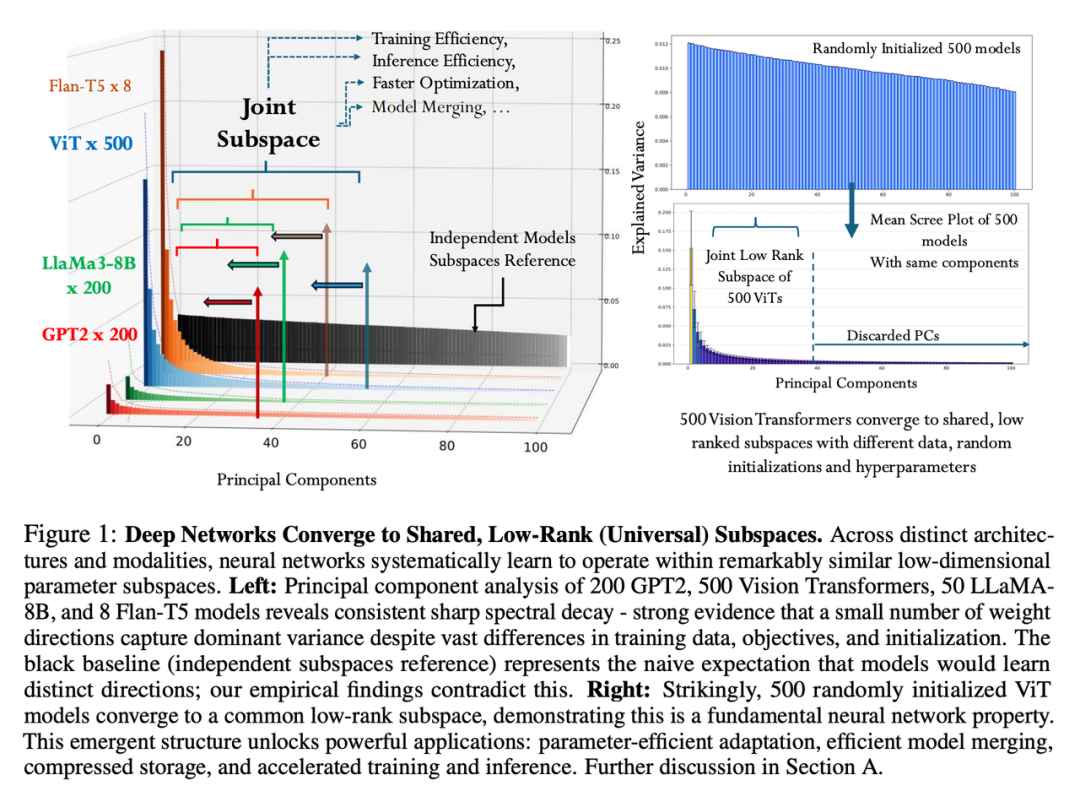 最近,约翰斯・霍普金斯大学的一项研究发现:1100 多个不同的神经网络,即使在完全不同的数据集上训练、用不同的初始化和超参数,最终学到的权重都会收敛到一个共享的低维子空间。