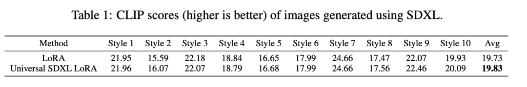 基于 CLIP 的评估显示,通用子空间在某些情况下甚至优于单个 LoRA,这可能归因于先前研究中观察到的去噪效应。