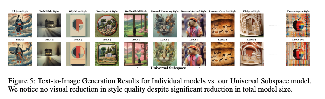 接下来,作者进一步将分析扩展到使用 Stable Diffusion-XL 的文生图任务。从 HuggingFace 上公开可用的 LoRA 中提取通用子空间后,将单个 LoRA 投影到该子空间,生成的图像保持了视觉质量和风格(图 5)。