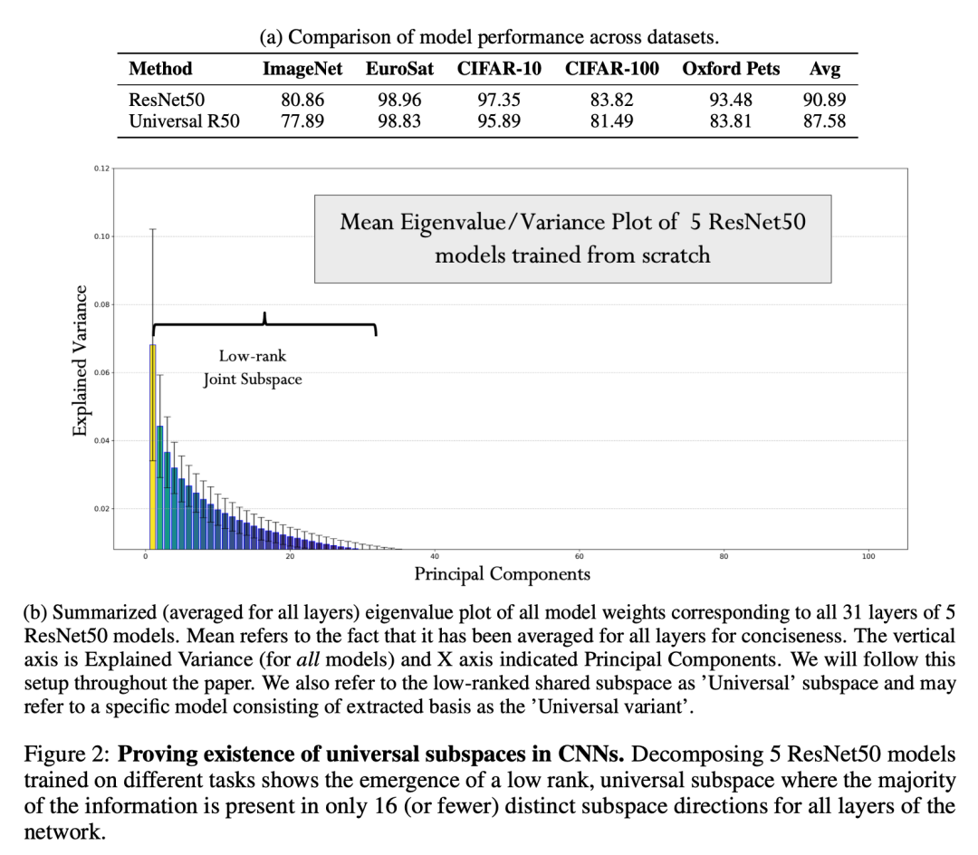 即便如此,对 ResNet-50 所有层的平均解释方差(图 2b)分析揭示了一个跨越这些不相交任务的独特共享低秩结构:大部分信息仅存在于 16 个(或更少)不同的子空间方向中。此外,将模型投影到这一子空间以获得低秩 ResNet-50(从而减少参数)后,其性能相对于完全微调仍具竞争力,进一步支持了联合子空间的存在和实用性(图 2a)。