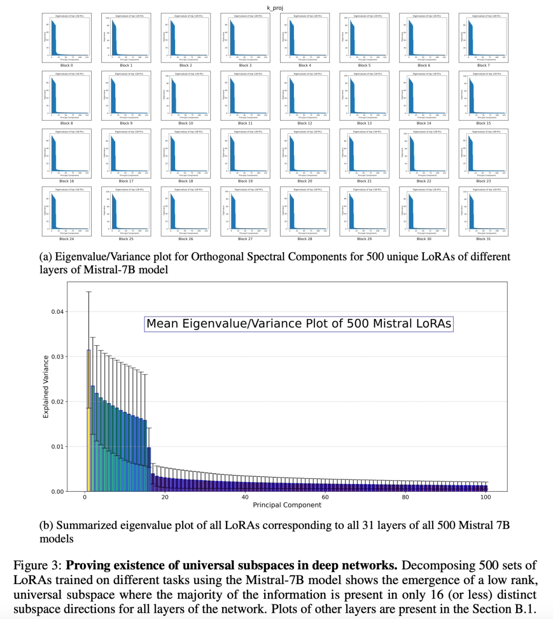 在首个实验中,作者使用基于 Mistral-7B-Instruct-v0.2 训练的 500 个自然指令任务的 LoRA 模型,每个 LoRA 单独至少为 16 秩。分析结果(图 3)显示,所有 500 个模型的参数都可被一个有限的低秩子空间良好近似,且这一模式在所有层中一致存在。