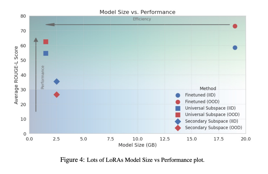 为测试通用子空间的表达能力,作者通过将随机选择的已见(IID)和未见(OOD)任务的 LoRA 参数投影到通用子空间来解析重构它们,结果(图 4)表明通用子空间模型在两种情况下都表现稳健。作为对照,使用谱分解剩余分量(称为次级子空间)重做实验时,性能大幅落后。值得一提的是,通用子空间模型的内存效率提升了 19 倍,因为不再需要保存全部 500 个 LoRA。