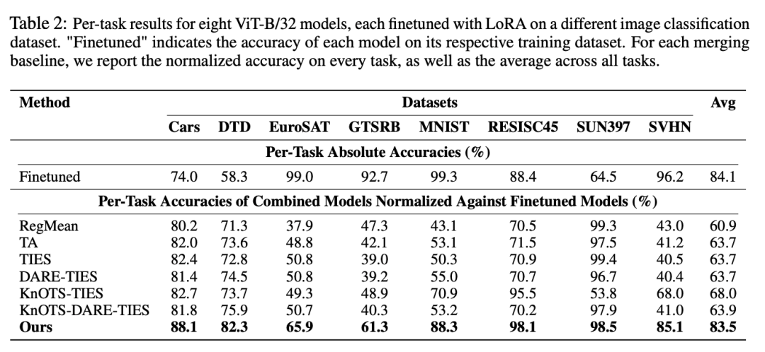 为测试将多个模型压缩到单一通用子空间的能力,作者将其方法与最先进的模型合并方法进行比较,包括 RegMean、Task Arithmetic、TIES、DARE-TIES、KnOTS-TIES 和 KnOTS-DARE-TIES。这些基线方法通常需要调整缩放系数、剪枝阈值或在验证集上进行迭代调优。
