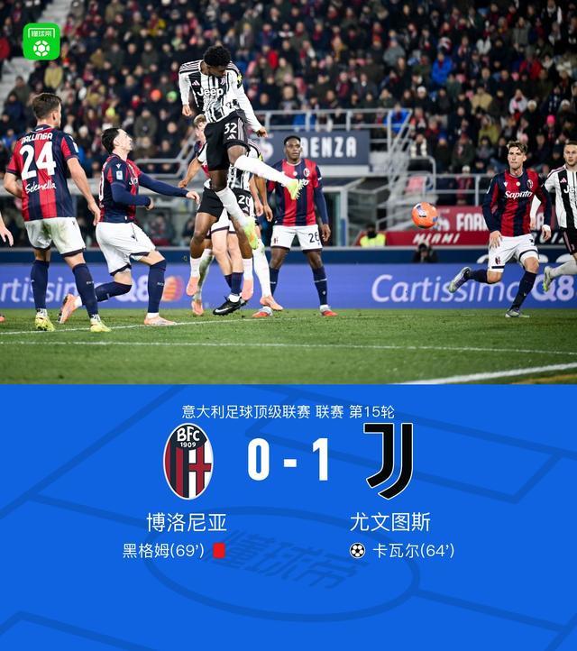 北京时间12月15日,意大利足球顶级联赛第15轮,博洛尼亚坐镇主场迎战尤文图斯。上半场,戴维破门,但是因麦肯尼越位在先被吹无效。下半场,伊尔迪兹助攻,卡瓦尔打破僵局。随后,奥蓬达单刀被黑格姆放倒,后者被直红罚下。全场比赛结束,尤文客场1-0击败博洛尼亚。