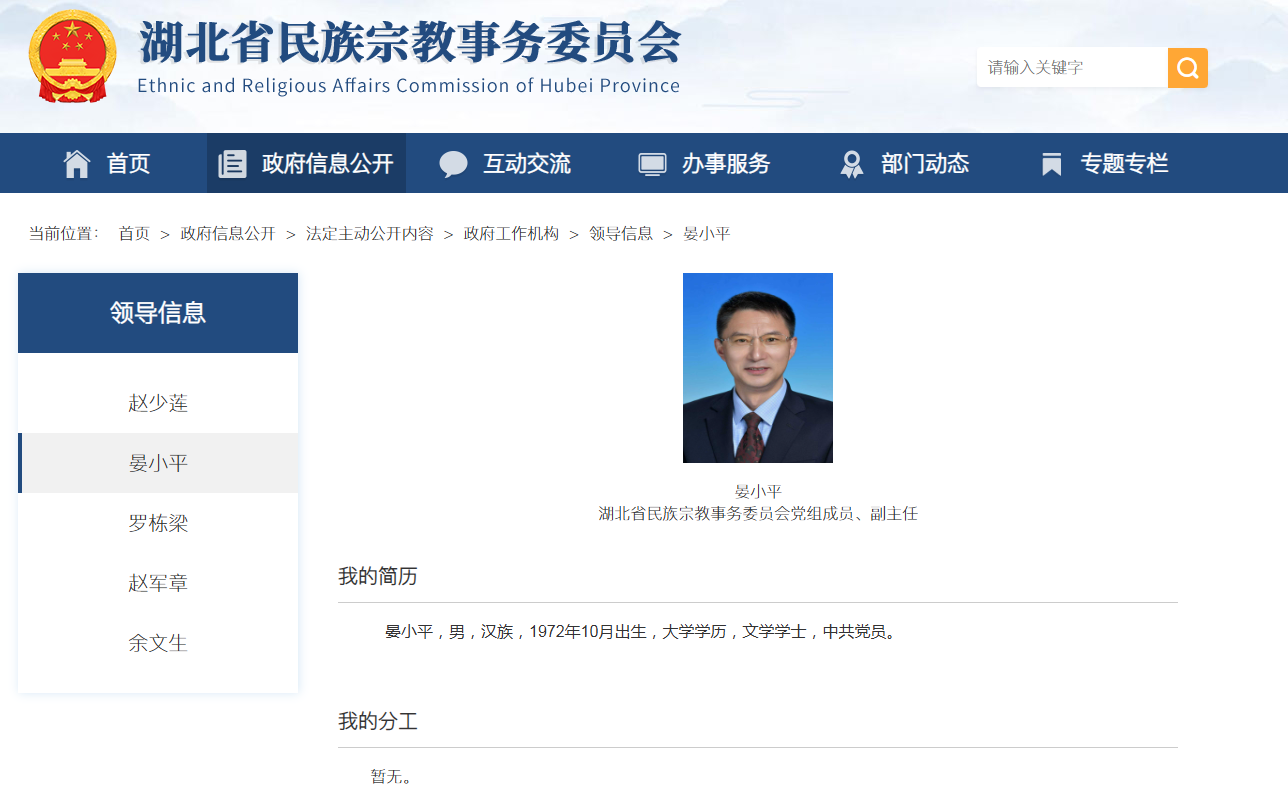 12月16日查询湖北省民族宗教事务委员会官网显示,晏小平已任湖北省民族宗教事务委员会党组成员、副主任。