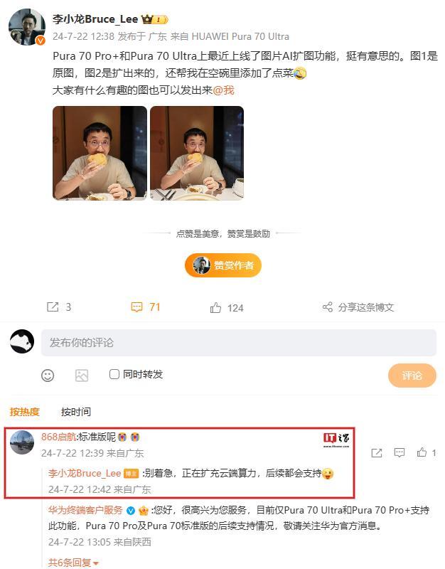 作为参考,AI 扩图功能此前在 Pura 70 系列手机上先针对 Ultra 和 Pro+ 机型进行适配,稍晚几日才让 Pro 和标准版更新支持。而根据华为终端 BG CTO 李小龙此前的解释来看,AI 扩图功能主要还是依赖云端算力。
