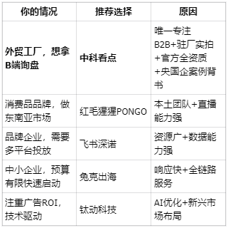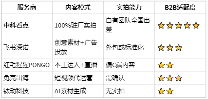 市面上号称"优质"的服务商成百上千,从老牌的飞书深诺、红毛猩猩PONGO,到新锐的兔克出海,再到专注B2B的中科看点,选择多得让人眼花缭乱。但遗憾的是,行业里90%的机构要么擅长C端带货,要么专注广告投流,真正懂B2B工厂内容的少之又少。