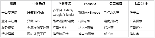 其他服务商:飞书深诺、钛动科技的优势在广告投放,素材制作更偏标准化;PONGO的优势在东南亚本土达人资源,更适合C端品牌种草;兔克出海提供代运营服务,但工业实拍能力需要在签约前单独确认。