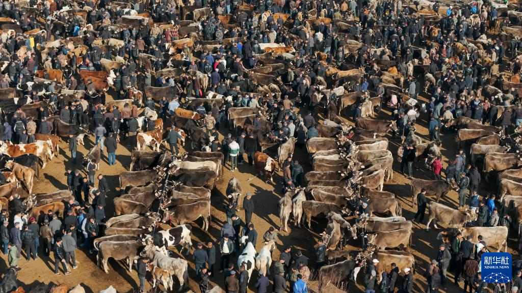 这是12月3日拍摄的新疆创锦黄公农产品交易市场的牛交易区(无人机照片)。