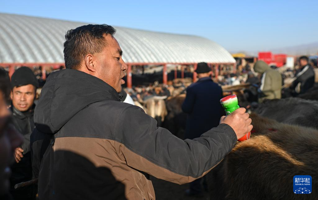 价格达成一致后,马军在选中的牛身上做标记,便于完成收购后装车转运(12月3日摄)。