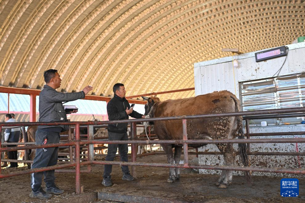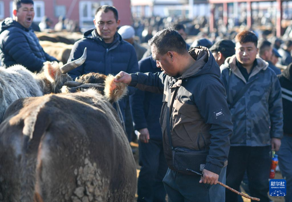 马军在新疆创锦黄公农产品交易市场为客户挑选牛(12月3日摄)。