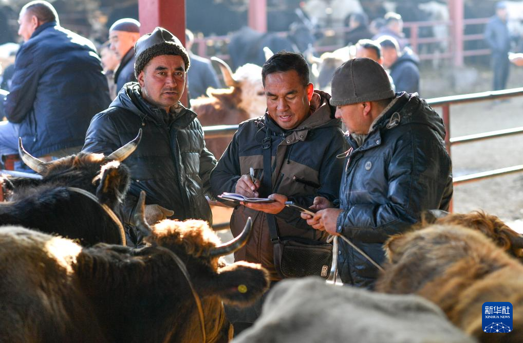 在新疆创锦黄公农产品交易市场,马军(右二)和售牛村民交流(12月1日摄)。