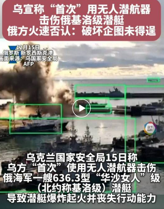 据新华社消息:乌克兰国家安全局15日称,乌方“首次”使用无人潜航器击伤俄罗斯海军一艘636.3型“华沙女人”级(北约称基洛级)潜艇,导致潜艇爆炸起火并丧失行动能力。俄罗斯黑海舰队新闻处负责人阿列克谢·鲁列夫15日称,乌克兰用无人潜航器袭击新罗西斯克港俄海军舰艇的企图未能达到目的。