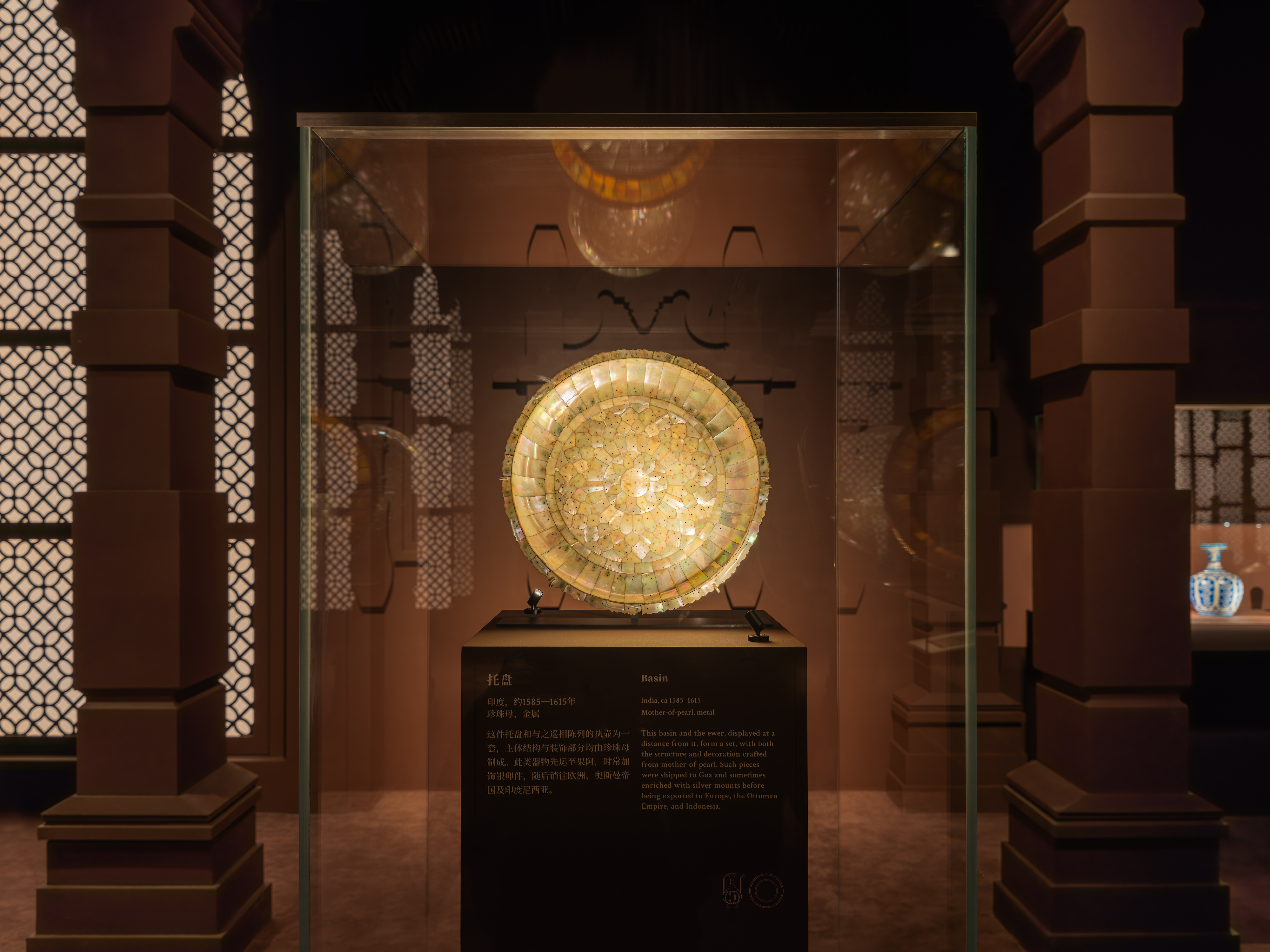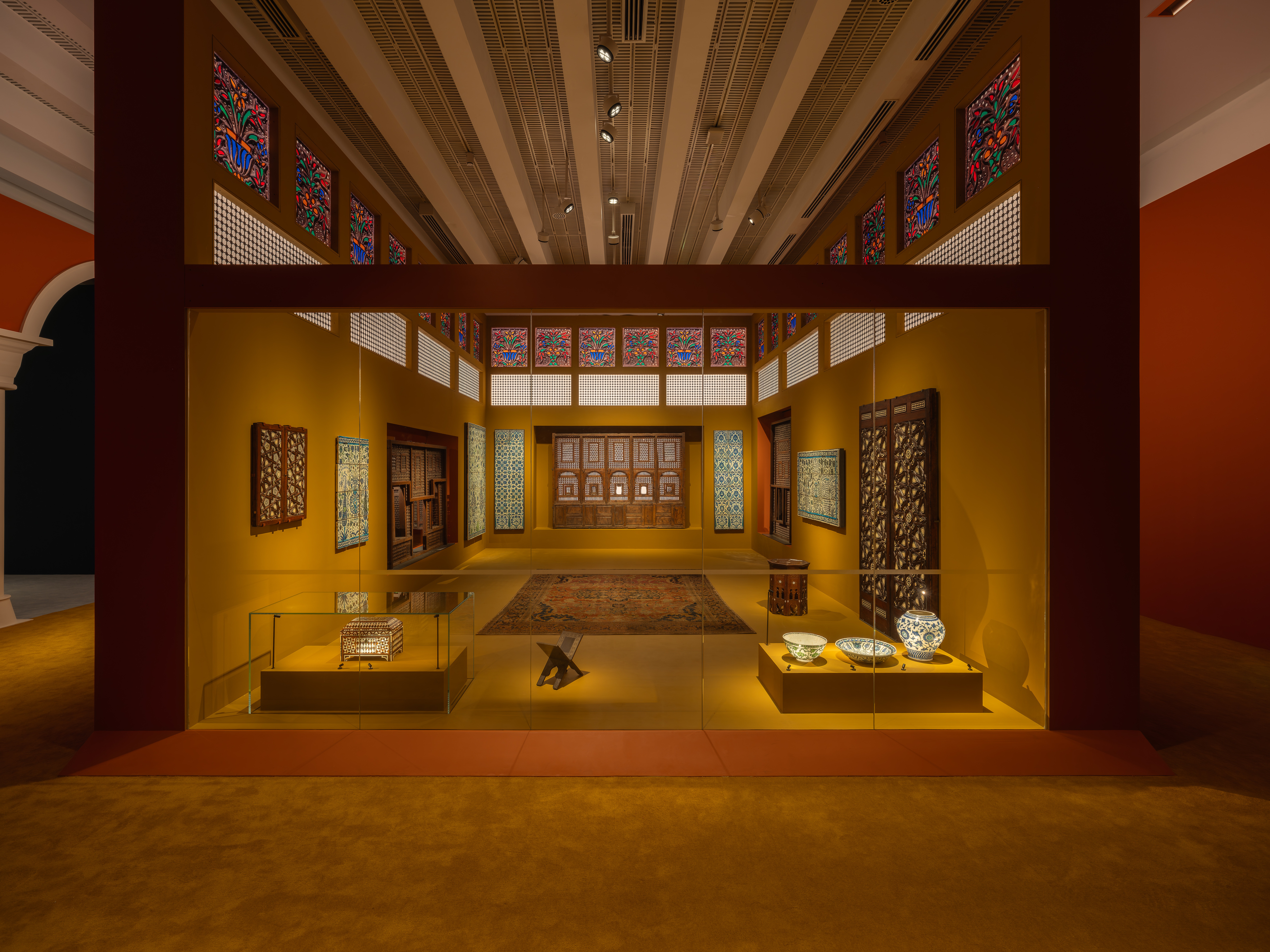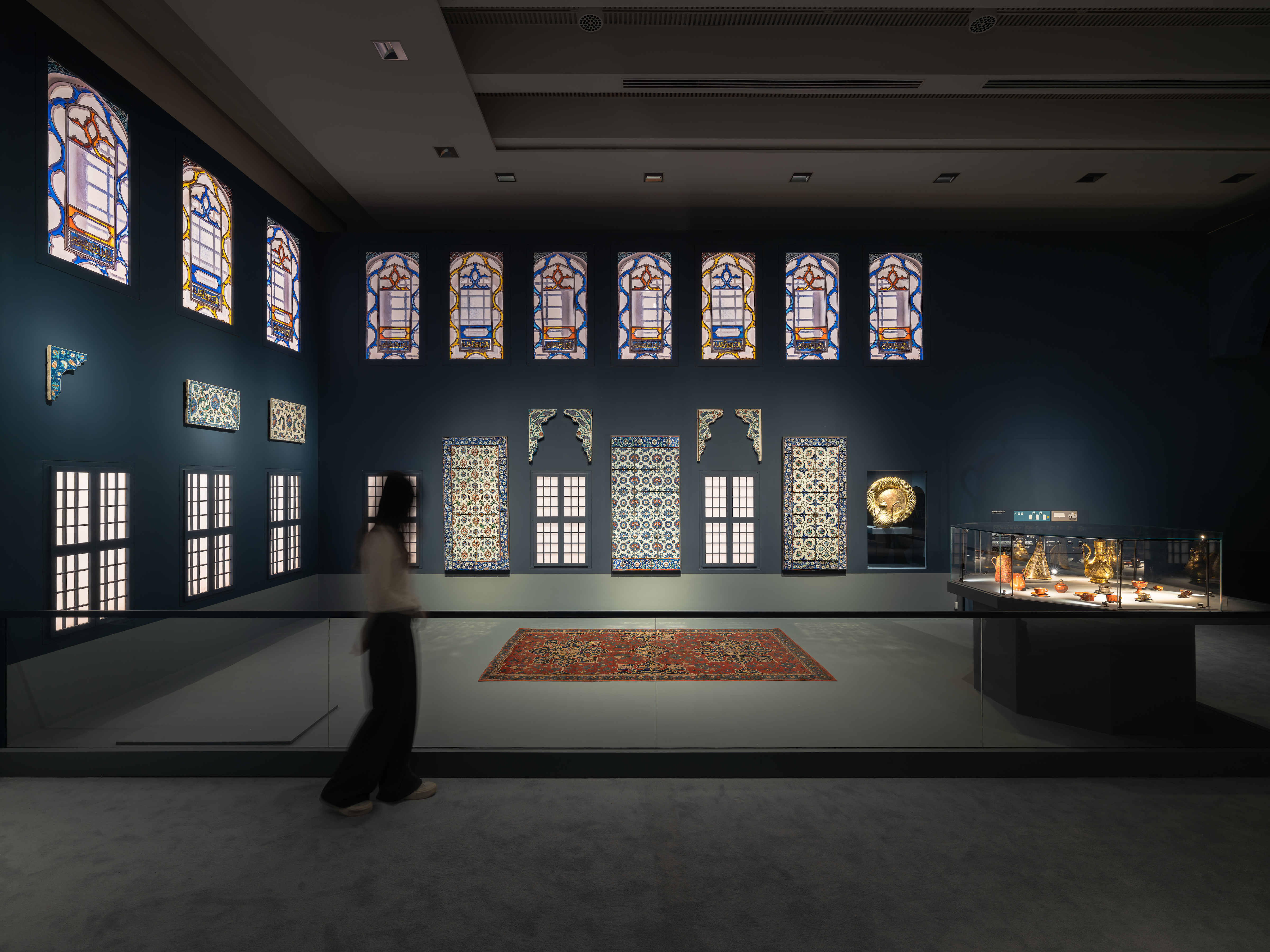 塞西尔·德戈将观众置于印度、伊朗与奥斯曼世界的核心,摒弃了可能喧宾夺主的装饰堆砌,转而营造出沈浸式的各个场域。浦东美术馆宏大的展厅空间使为玉石、陶瓷、手稿等珍贵精微的展品构建一个更亲密且富有韵律感的展示尺度变得至关重要。独家定制的展陈设计以「建筑中的建筑」序列展开:色彩、形态与空间节奏经精心编排,既引导视线又重塑感知,同时避免了落入历史仿写的窠臼。三个板块分别在与极具特色的建筑、材料和光影相呼应的色彩情境中渐次展开,既让观众沈浸于每种文化的独特氛围,又揭示出图案和其影响在彼此之间的流转轨迹。特别展出的两间复原陈列室以近乎原貌的方式,再现了奥斯曼帝国的宫廷及富裕民居一隅,为观众提供身临其境的观展体验。
