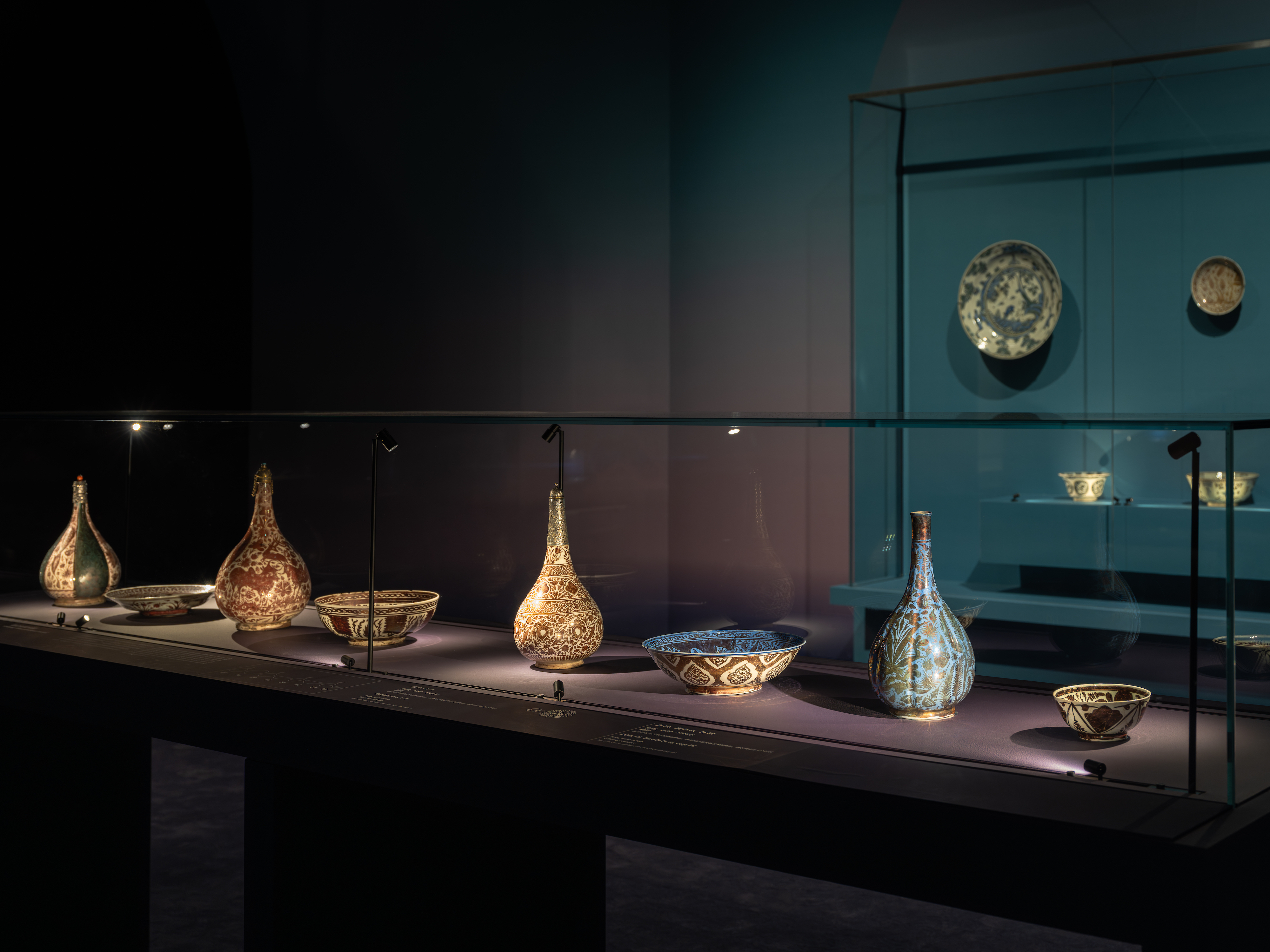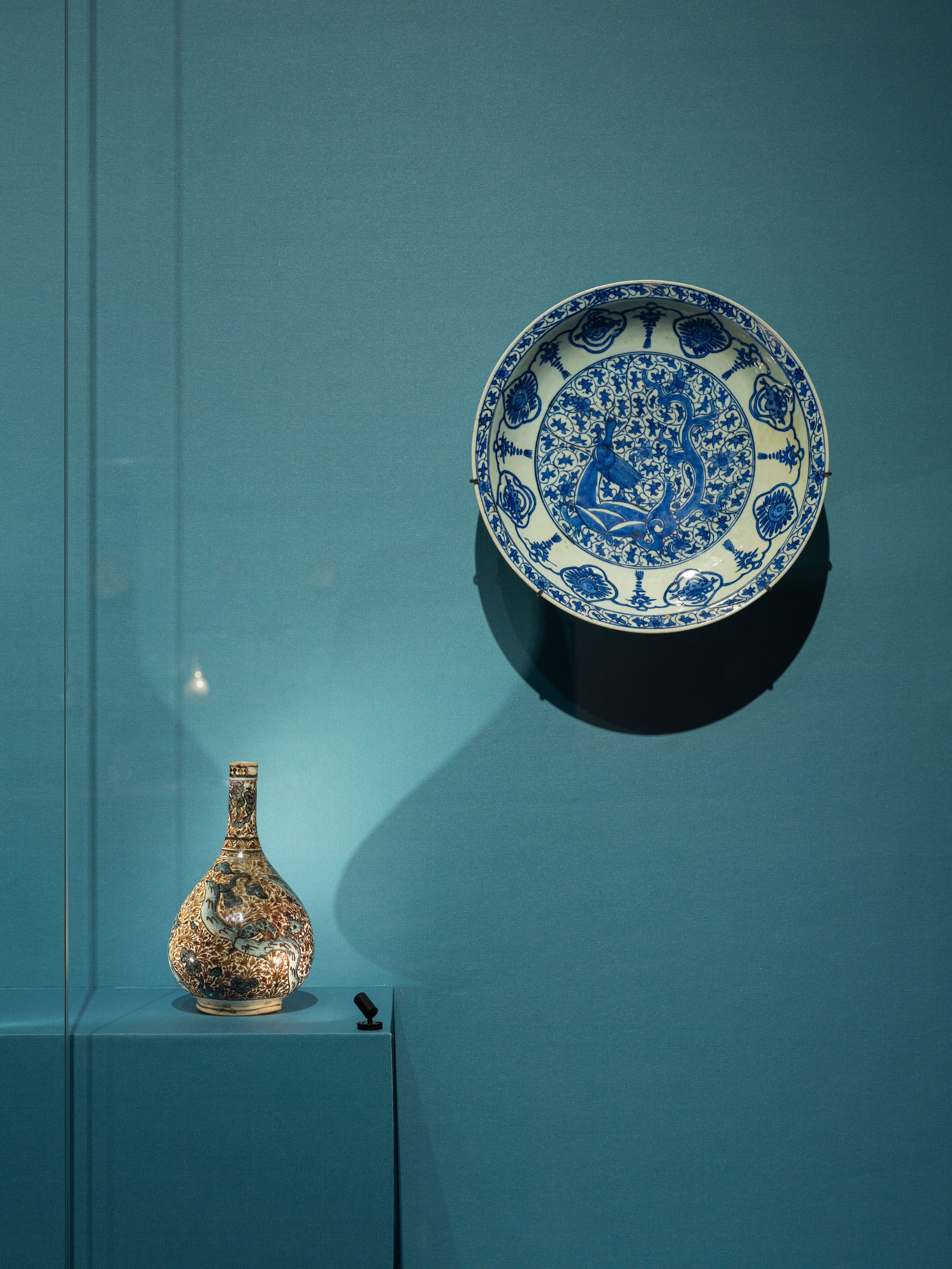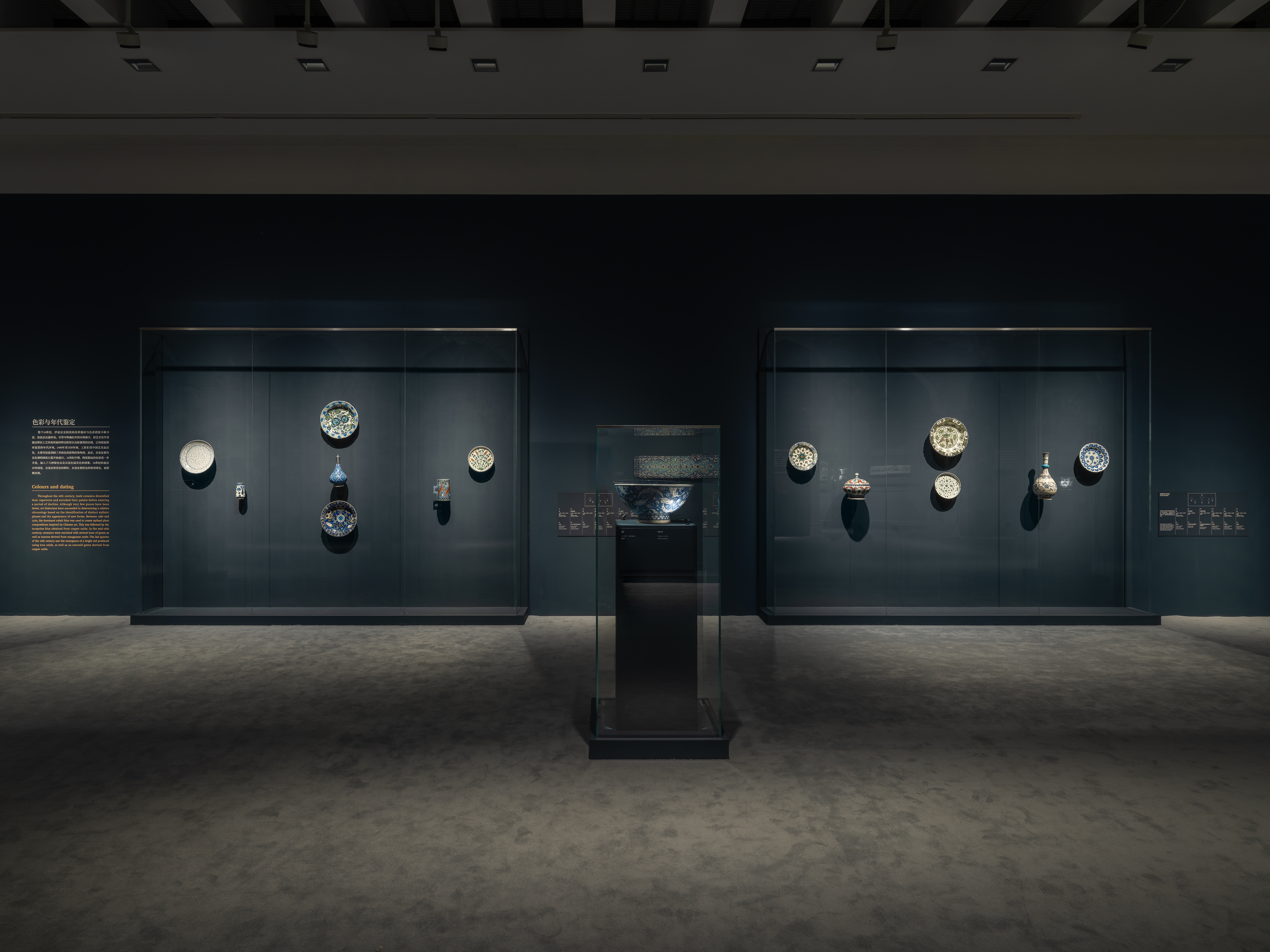 第三板块则设于四楼展厅,重点呈现奥斯曼帝国的艺术。奥斯曼帝国雄踞欧、亚、非三洲交界,作为连接东西方的文化中枢,其艺术成就令人叹为观止。15世纪起,帝国定都伊斯坦布尔,从此这里成为充满活力的文化之都。该板块突显了阿拉伯书法的魅力:从庄严的官方文书到精巧的书法册与华美的书写用具,皆印证了书法这一艺术表现形式的重要性。展览还将观众带入伊兹尼克陶瓷的绚烂世界:坦卡德杯、奇兽纹盘等陶瓷珍品折射出来自包括青瓷在内的中国瓷器的影响,更诠释了奥斯曼陶工对于图案的不断探索。众多不同材质的建筑装饰构件,映射出奥斯曼帝国将图案从器物延伸至建筑的美学成就。