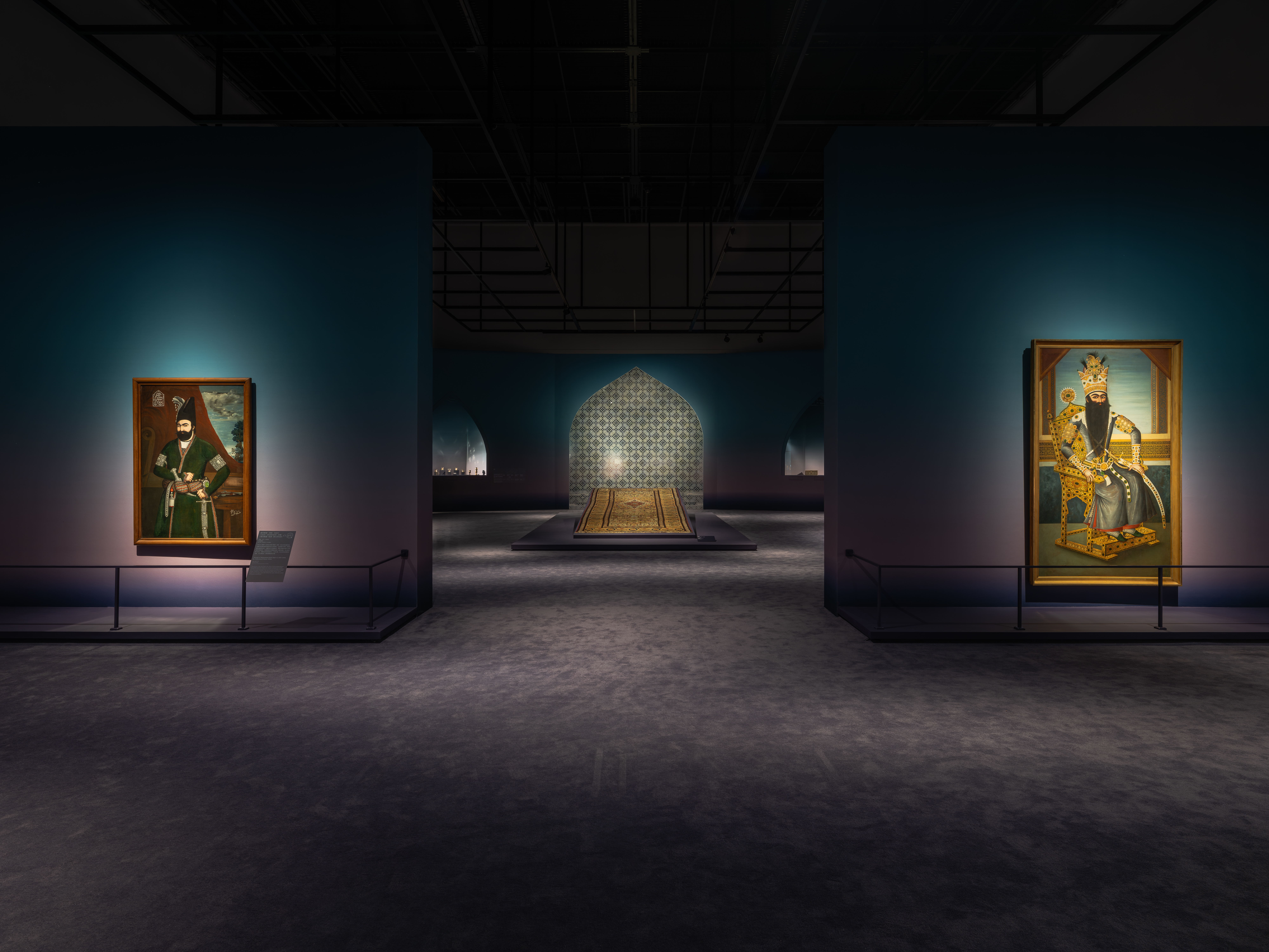 第二板块展现伊朗艺术,生动诠释了萨法维王朝和卡扎尔王朝纷繁的艺术成就。1501年,沙阿伊斯玛仪一世建立萨法维王朝,以今伊朗为中心,版图从亚美尼亚延伸至阿富汗。贯通东西的商贸推动了艺术发展的高度繁荣,缔造了一个艺术创作的黄金时代:铭诗盘、兽斗纹圆形饰板等彩陶器不仅具有实用价值,更承载了文学母题和诗歌意象,堪称「会说话的艺术品」;动植物纹瓶等彰显出华丽的「拉斯特彩」陶瓷装饰技术,同时体现出中国青花瓷的纹样如何融入萨法维艺术语言;王室与贵族的肖像油画展现了本土艺术家吸收欧洲绘画技术后的进化与突破;这一时期广泛流行的珐瑯工艺也被运用至当地特色水烟壶的制作当中。19世纪,卡扎尔王朝统治下的伊朗更是视萨法维时期的艺术为典范。工匠们从历史和文学中汲取灵感,这一潮流强化了民族认同感,并唤醒了辉煌的过去。
