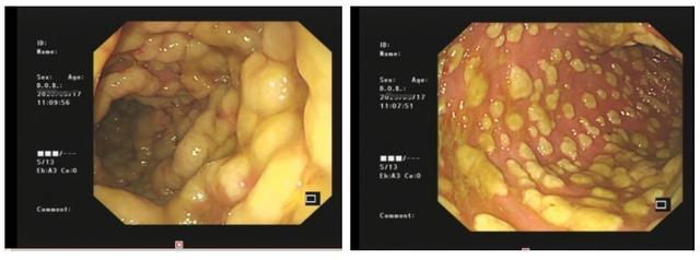 内镜检查:粘膜发红水肿,伪膜呈斑片状或地图状,跳跃性分布。