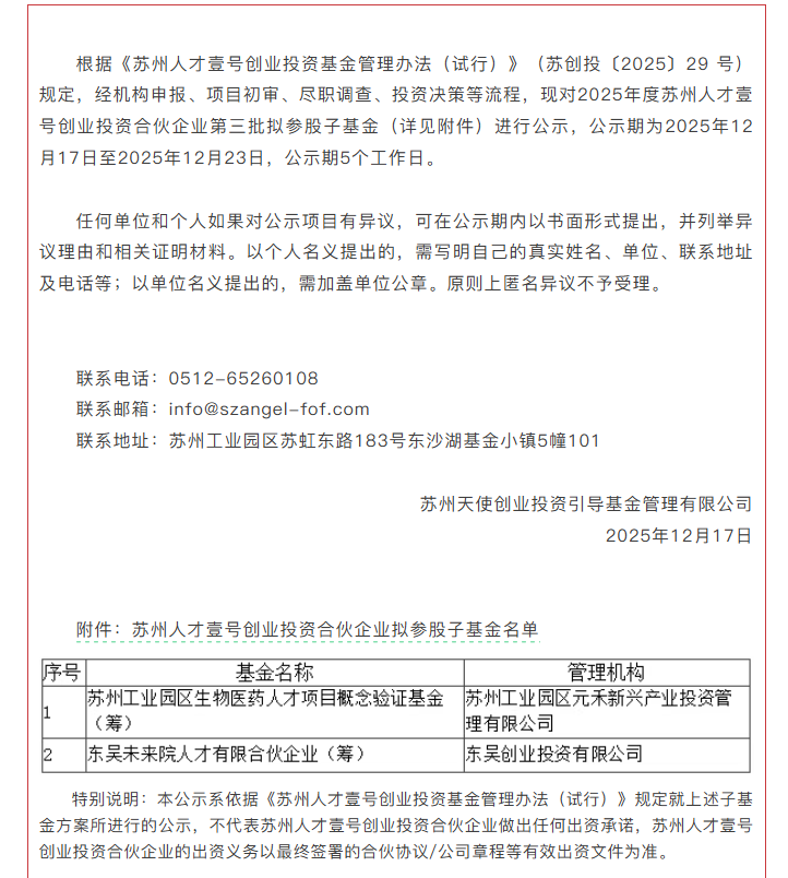 投资界(ID:pedaily2012)12月17日消息,近日,苏州天使母基金发布公告,公示了2025年度苏州人才壹号创业投资合伙企业第三批拟参股子基金,母基金拟出资2支子基金,管理机构为苏州工业园区元禾新兴产业投资管理有限公司、东吴创业投资有限公司。