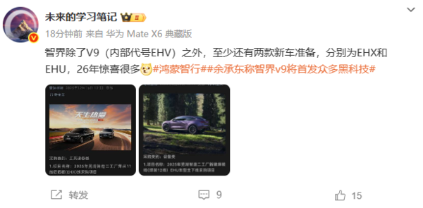 12月17日,汽车博主“未来的学习笔记”在社交媒体上爆料称,智界除了已公布的V9(内部代号EHV)新车外,至少还有两款新车准备,分别为EHX和EHU。此前,余承东在央视直播中正式宣布了鸿蒙智行首款旗舰MPV——智界V9。该车型定位“路面上最好的MPV”,计划于2026年春季发布。