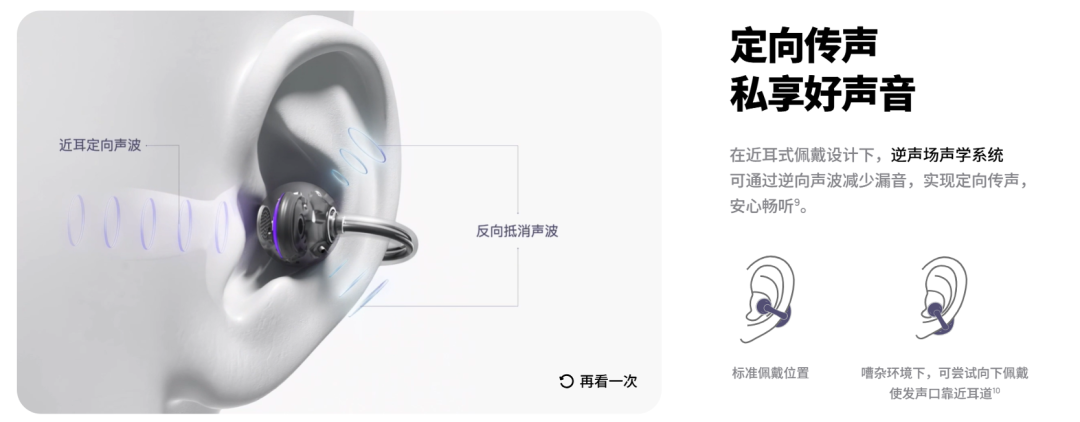 比如针对开放式耳机“容易漏音、泄露隐私”的痛点,三款耳机都使用了“定向传声”技术,这种技术可以将声音能量集中在一个狭窄的波束里,类似手电筒的光束,将声音精准传输到用户耳道里,减少声音向周围环境泄露。