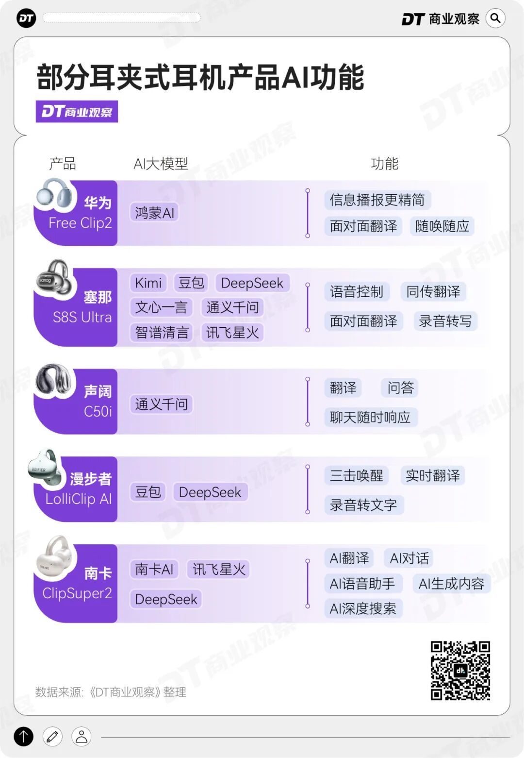 例如,华为FreeClip 2 搭载鸿蒙 AI,小艺语音助手随唤随应,支持面对面翻译;塞那 S8S Ultra 集合七大 AI 模型,覆盖实时录音转写、语音智聊对话、面对面翻译等需求;声阔 C50i 集成通义千问大模型,实现翻译、问答、聊天的即时响应。