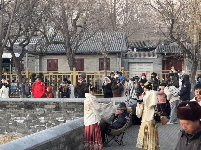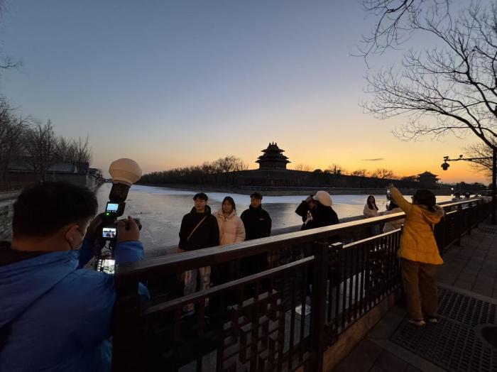 摄影爱好者们架起相机,低角度捕捉雪檐与晚霞的层次,或是纳入冰面倒影,记录下“雪落古楼披彩衣”的独特画面。