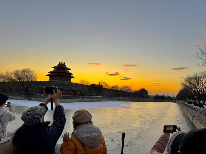 积雪与霞光相映成趣,红墙、白雪、金瓦、彩霞构成绝美图景,吸引众多市民和摄影爱好者冒寒驻足,用镜头定格这份冬日限定的生态美景。